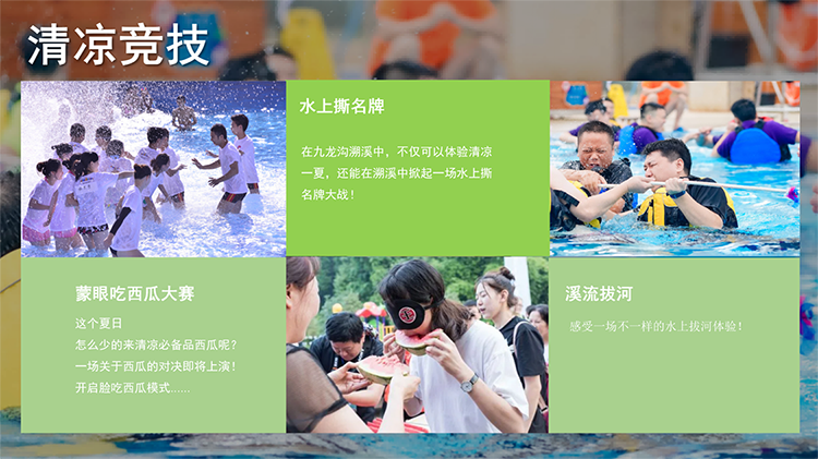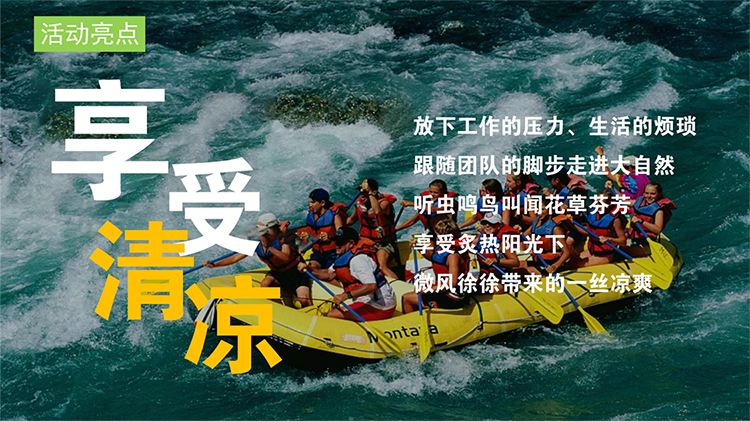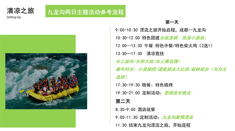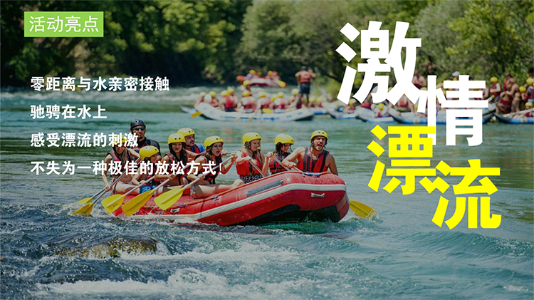 漂流丨“清凉一夏 激情漂流”九龙沟漂流主题活动 团建目的:焕发热情 释放压力 充值正能量 休闲放松 新员工激活 增强认同归属 增强凝聚力 高效沟通 绩效奖励 团队荣誉感 适合团队: 所有团队 初创融合 成长型团队 成熟型团队 高阶领导 中层骨干 年轻化团队 基层员工 超级业务员 公司全员 适合人数:15~300 活动天数:1天 推荐场地:景区古镇 自然野外