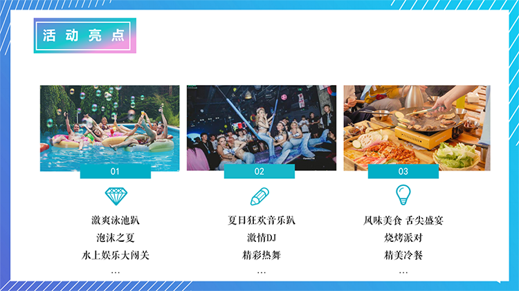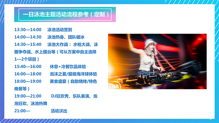 泳池丨“激爽盛夏 High Fun ”泳池主题活动 团建目的:焕发热情 释放压力 充值正能量 休闲放松 新员工激活 增强认同归属 增强凝聚力 弘扬开云最新官方 团队荣誉感 适合团队: 所有团队 初创融合 成长型团队 成熟型团队 高阶领导 中层骨干 年轻化团队 基层员工 超级业务员 公司全员 党政机构 团委工会 班组长 EMBA、MBA班 青少年 适合人数:15~300 活动天数:半天 1天 推荐场地:自然野外 培训基地 室内场馆