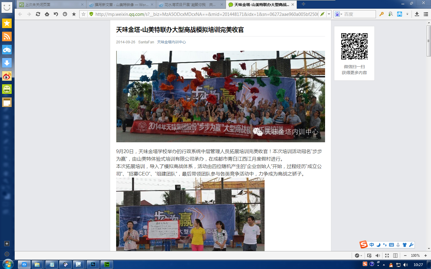四川恒泽第二季“凝心聚力 放飞快乐”拓展活动 四川恒泽建材为进一步提升员工的集体荣誉感和团队意识,于2017年4月21日组织开展户外拓展训练活动。 此次户外拓展训练项目需要员工的全情投入,并且每个项目都具有一定的难度,想要顺 利通过,则需要跨越自己的“心理极限”,突破自我,并与自己的团队相互配合,相互支持,集体协作,同时经教练老师有针对性的点评与启发,达到挑战自我、熔炼团队、提高沟通力、协作力的培训目的。 拓展训练在彭州宝山,参加人员被随机分为四队,通过集体讨论,确定了各自的队长、队名 小猫下乡:山美特户外拓展训练 拓展训练基地很有中国味道这里农家乐的名字和布局都很有艺术气息生态农场的蔬菜都没打过农药也没施过化肥,自己采摘,全部20/斤像雄鹰的翅膀,谁知道这是什么树 啥情况?难道要玩丢 天味金塔-山美特联办大型商战模拟培训完美收官 9月20日,天味金塔学校举办的行政系统中层管理人员拓展培训完美收官!本次培训活动冠名“步步为赢”,由山美特体验式培训有限公司承办,在成都市青白江西江月度假村进行。本次拓展 花水湾项目开展“凝聚你我 共赢未来”的体验式培训 5月16日,花水湾项目组织全体员工到山美特顺江基地进行了为期一天“凝聚你我 共赢未来”的体验式培训。参培人员被随机分为了红、蓝两个对抗队开展 “穿越丛林”和“超 饭店管理公司工会举办主题拓展训练 11月1日,难得的阳光灿烂的日子。由锦江饭店管理公司工会和团支部组织的“卓越,因为有我”主题拓展训练在山美特顺江基地展开。公司本部、锦宾物业公司、饭店事业部在管酒店、 中国农业银行X县支行年度拓展培训简报 4月13—16日,我局参加了中国农业银行X县支行组织的“阳光团队,激扬自我”主题体验式培训,本次活动在山美特拓展基地——XX县石鹿山庄、XX山进行,活动旨在通过户外拓展的培 金山官方博客:从“阿拉丁魔毯”到七巧板 成都魔幻拓展记 作者:成都金山/亚丁产品平台 赵伽对于传说中的拓展培训我一直很感兴趣,最近在公司的组织下终于有幸参与了一次。果然寓教于乐,其乐无穷,让我受益匪浅。两天的训练很紧凑,项目很多 benbaby的共享空间 用真诚的心面对真实的自己: 山美特之行 前两天单位组织去山美特拓展训练,时间跟我考试的时间相冲突,我犹豫了下还是选择放弃了考试去参加了。当我踏上那片土地的时候,我知道我一生都不会后悔这次放弃,考试以后有的是机 中国建筑西南勘察设计研究院:提升沟通力度加强队伍团结 为庆祝中建总公司组建 25 周年,加强院领导和团员之间的沟通,促进团员青年间的相互了解, 培养共青团员的团队精神、坚毅性格及企业责任感, 5 月 11 日 ,由院团委组织的“团队协作 成都HRClub:我们可以做得更好 盛夏的7月9号,以前应该是“黑色七月”高考的日子,今年却不同,高考早已结束!这一天,中华英才网成都分公司推出了新一期HR CLUB活动——“团队协作与高效沟通”户外体验式培训 !这次 共50条记录,5页 开云最新官方 上一页 1 2 3 4 5 下一页 尾页