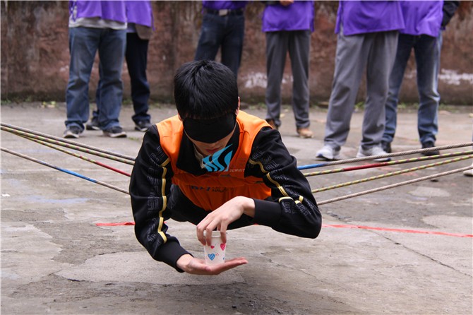 使用道具:一条边界绳 两条队员用的绳 两个矿泉水瓶(其中一个有水,一个没有)