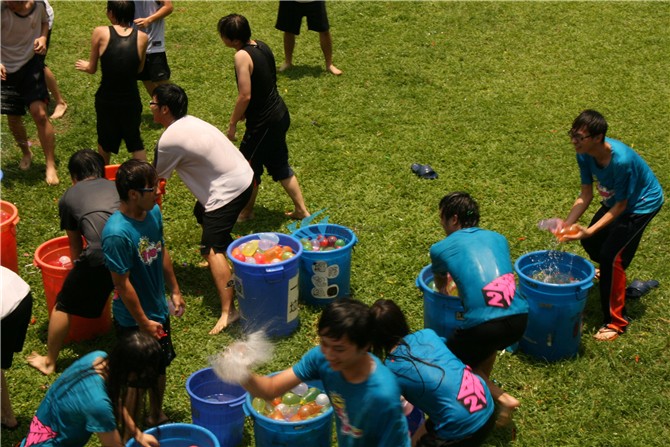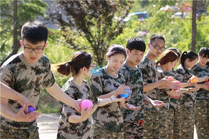 2)本游戏还可以有多种变换形式,带来不同的乐趣和挑战。例如,所有的学员可以围成一个圆圈,然后将水球抛给对面的学员。当所有学员同时将水球 抛向空中的时候,漫天水球,会让人眼花缭乱,惊险刺激。另外,也可以让所有学员站成两排,不是将水球抛给对面的学员,而是抛给斜对面的学员,甚至中间多隔 几名学员,会更具有挑战性。还有,在抛接水球的时候,每一对学员不在抛接一个水球,而是抛接两个水球。这样难度就会更大,也会更加的刺激。