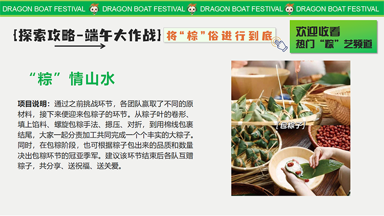 端午丨“粽趣横生·重拾玩心”疯狂游园会、端午粽动员、巧手端午 团建目的:休闲放松 增强认同归属 增强凝聚力 弘扬开云最新官方 适合团队: 所有团队 初创融合 成长型团队 成熟型团队 高阶领导 年轻化团队 基层员工 公司全员 党政机构 适合人数:15~300 活动天数:半天 1天 推荐场地:景区古镇 公司现场
