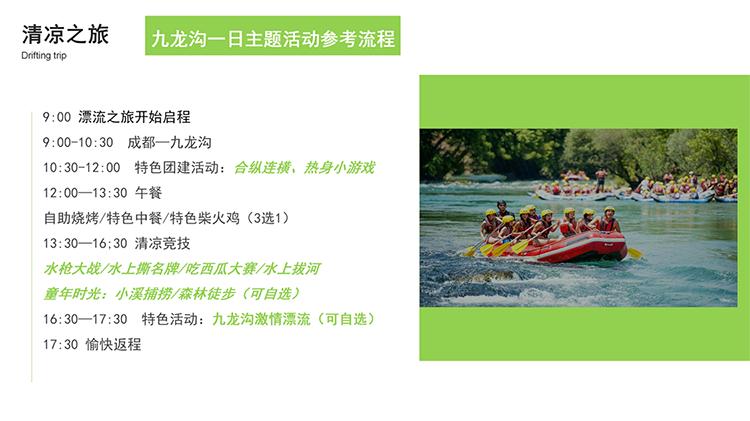 漂流丨“清凉一夏 激情漂流”九龙沟漂流主题活动 团建目的:焕发热情 释放压力 充值正能量 休闲放松 新员工激活 增强认同归属 增强凝聚力 高效沟通 绩效奖励 团队荣誉感 适合团队: 所有团队 初创融合 成长型团队 成熟型团队 高阶领导 中层骨干 年轻化团队 基层员工 超级业务员 公司全员 适合人数:15~300 活动天数:1天 推荐场地:景区古镇 自然野外