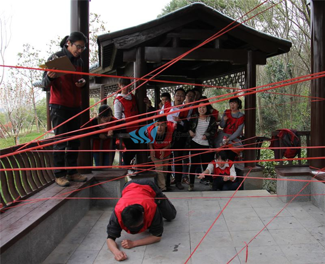 团队成员2人1组,为穿越一个模拟有红外线的封锁的空间相互合作,1位其中穿越的队员眼睛被蒙蔽起来,另一位队员指挥他用最短的时间突破封锁区。
