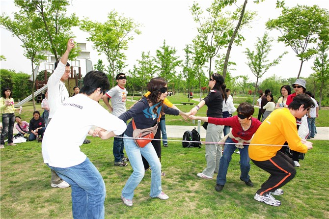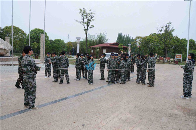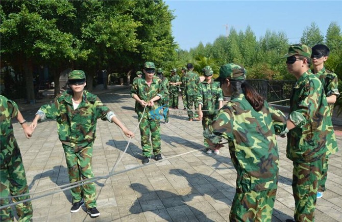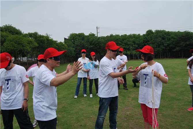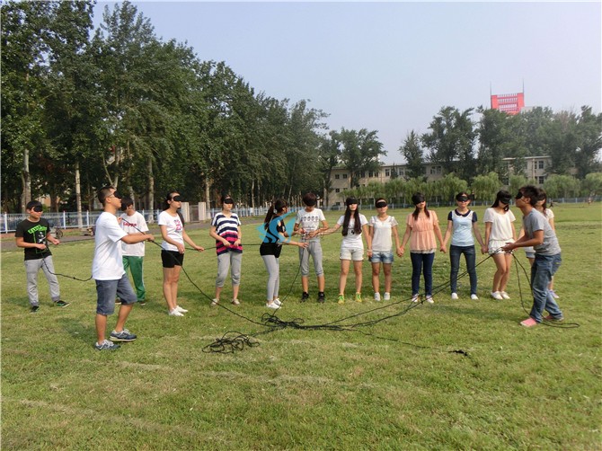 5、当你们确认提前完成后,将绳踩在脚下,并通知拓展教师,得到准许后才可以按照拓展教师的要求摘下眼罩。