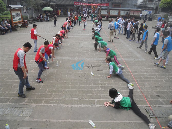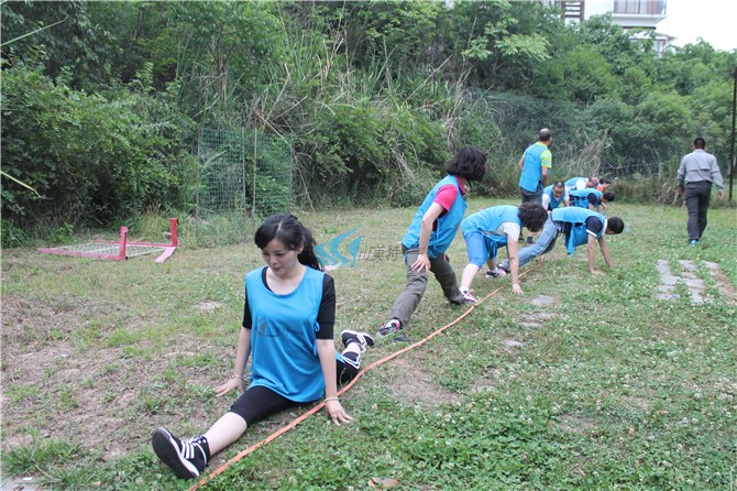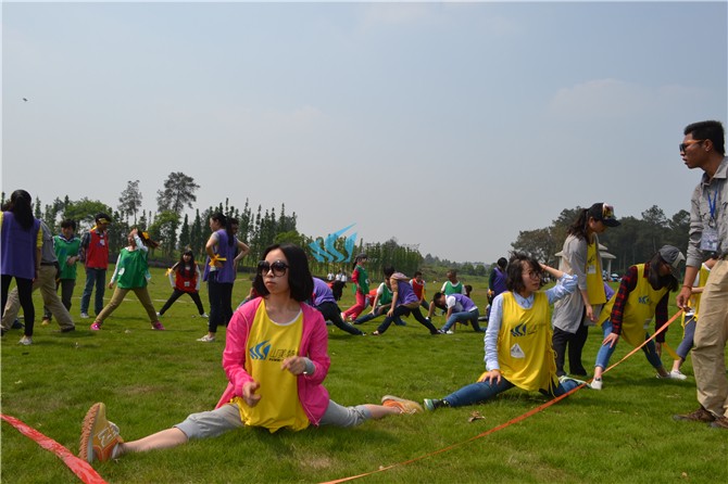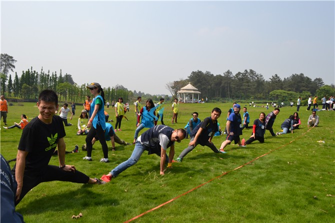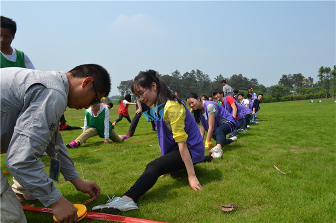 各队全员参加(或指派5-10名队员参加),所有参与队员最大限度将两腿分卡,每个人之间脚与脚相连,工作人员从第一名队员开始到最后一名队员进行长度的测量,长度最长的团队将获得第一名。