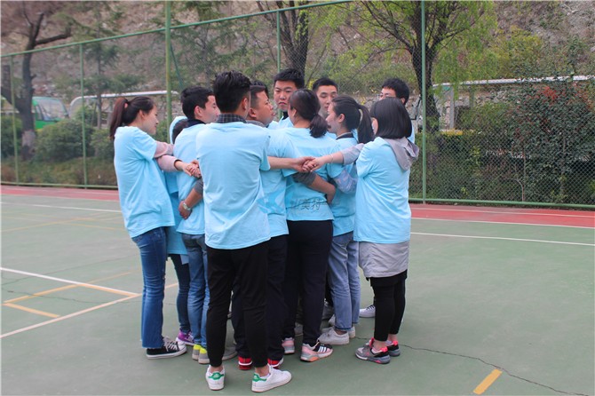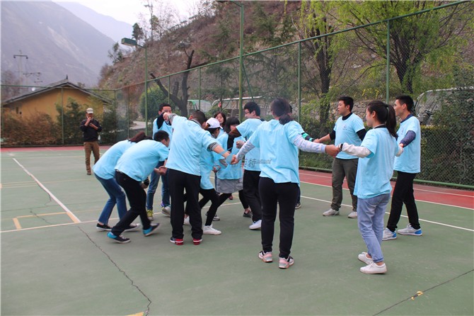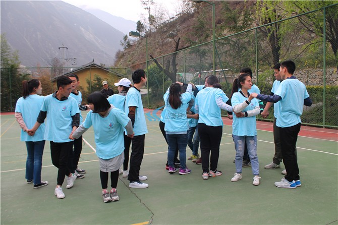 培训师让每组圈着站成一个向心圈,培训师说:先举起你的右手,握住对面那个人的手;再举起你的左手,握住另外一个人的手;现在你们面对一个错综复杂的问题,在不松开的情况下,想办法把这张乱网解开,告诉大家一定可以解开,但答案会有两种:一种是一个大圈,另外一种是两个套着的环。